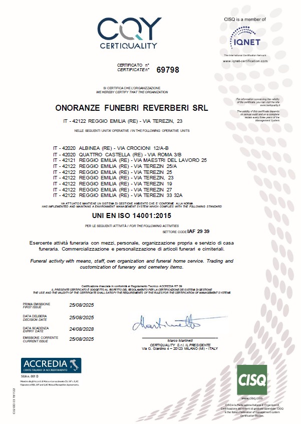 Nel luglio 2013 è tra le prime cinque imprese funebri italiane, la prima in Emilia Romagna, ad ottenere la Certificazione di Qualità ISO 9001 nel rispetto della norma UNI EN 15017, sia riguardo all’impresa stessa che alla gestione della Casa Funeraria.